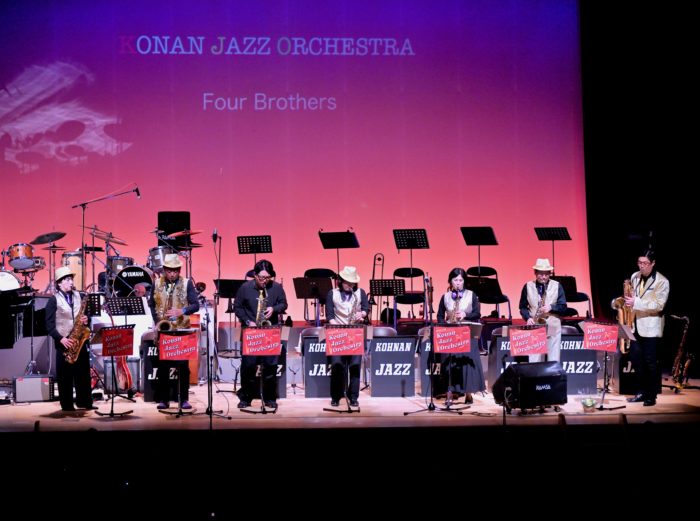 第1部は、恒例の総合司会志水氏の軽妙痛快な前説?とカウントダウンから、「江南ジャズオーケストラ~!」の発声でスタート!インストゥルメンタル曲にてビッグバンドの魅力を楽しんでいただきました。複数の新メンバーが増えたことにより、ホーンセクションはトランペット5人、トロンボーン5人、サックス7人を、エキストラ(助っ人)を頼むことなく、自前(オールメンバー)で揃えることができ、誇らしくも感無量な幕開けでした。