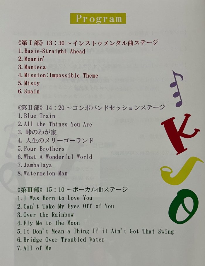 第3部は、ボーカル かけのけいこと、志村恵美子が、ビッグバンドサウンドをバックに、交互に、時にデュエットで、情感たっぷりに、パワフルに、歌い上げてくれました。尚、今回コンサートの中ではあまり触れませんでしたが、実はソロを取るメンバーが増えてきたことも、喜ばしいKJOの進化と感じています。魅力的なソロを取れるメンバーが増えたことで、総体的に楽曲の演奏レベルも上がって来たのではないかと、甘い?自画自賛(笑)